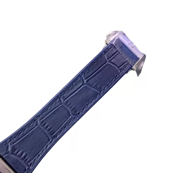 The watch is paired with a blue leather strap, complementing the dial and adding a luxurious tactile experience. With adjustable links and a folding clasp made from 904L stainless steel, the band offers both comfort and versatility, fitting wrists of various sizes with precision.