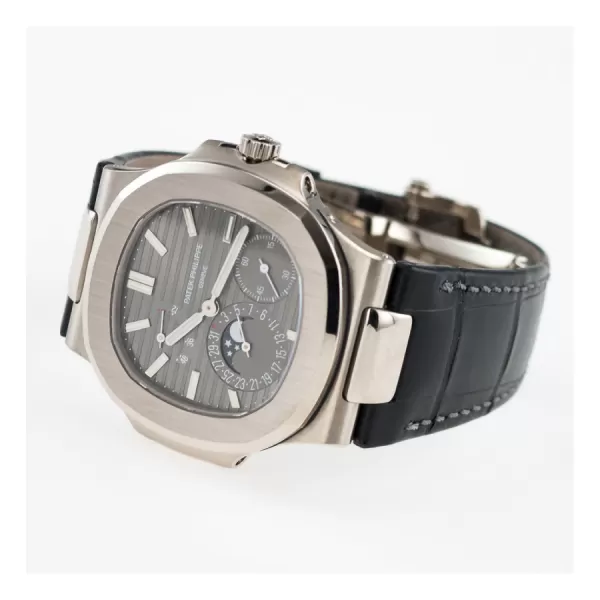 The Patek Philippe Nautilus Moon Phase Replica is a high quality watch. It features a 904L stainless steel case with a steel bezel and sapphire crystal. The movement is an automatic caliber 240 PS IRM C LU with a power reserve of 60 hours and a precision of -3/+3 seconds per day within COSC certification limits. The second hand has a sweep motion. The bracelet is made of leather with an adjustable link and a stainless steel fold-over clasp.The dial is grey with stick and dot indices and 904L stainless steel stick hands. The functions include hours, minutes, small seconds, date, moonphase, and power reserve indicator. The watch has passed the 30m water resistance test and is protected by a full 2 year international United Luxury warranty. It is a perfect 1:1 super clone Swiss mechanism watch that even your jeweler won’t be able to tell the difference.