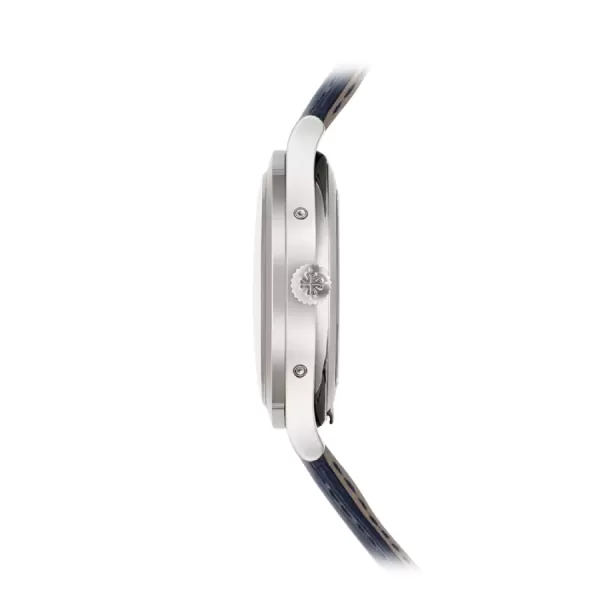 The Patek Philippe Complications 5396G-017 Replica is a distinguished dress watch that blends refined aesthetics with horological complexity. Featuring a 38.5mm case made from 904L stainless steel with a white gold finish, it exudes understated elegance. The charcoal gray sunburst dial includes white gold applied Breguet numerals, dauphine hands, and a double aperture at 12 o’clock showing the day and month.