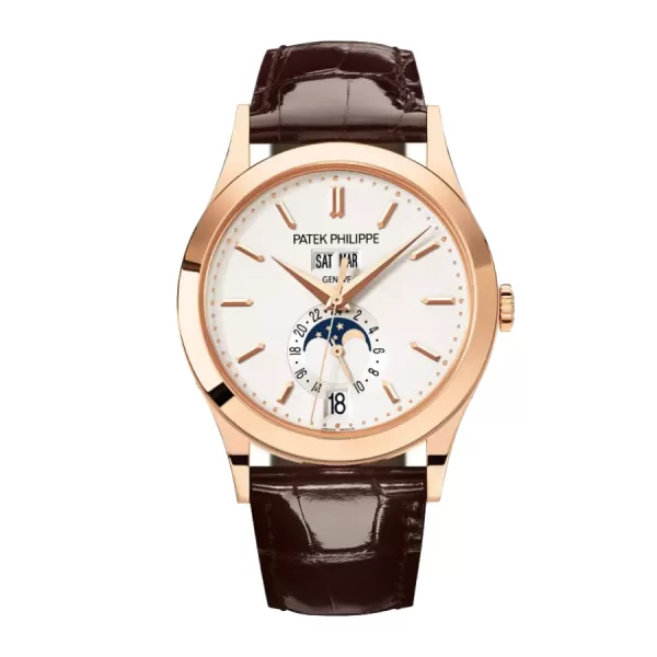 The Patek Philippe Complications 5396 R- 011 Replica is a sophisticated timepiece that blends classical design with practical functionality. Housed in a 38.5mm 904L stainless steel case with a luxurious rose gold finish, it features a silver sunburst dial adorned with applied hour markers, dauphine-style hands, and elegant calendar complications. The day and month are displayed through twin windows at 12 o’clock, while a moon phase indicator and date subdial sit perfectly at 6 o’clock, offering a harmonious, balanced layout.
