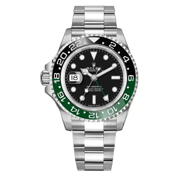 Its striking green and black Cerachrom bezel—nicknamed “Sprite”—perfectly complements the black dial, polished hour markers, Chromalight luminous accents, and the signature green GMT hand. The layout provides excellent legibility and a bold visual identity ideal for frequent travelers.