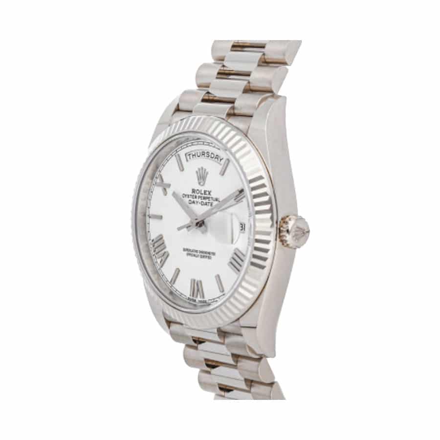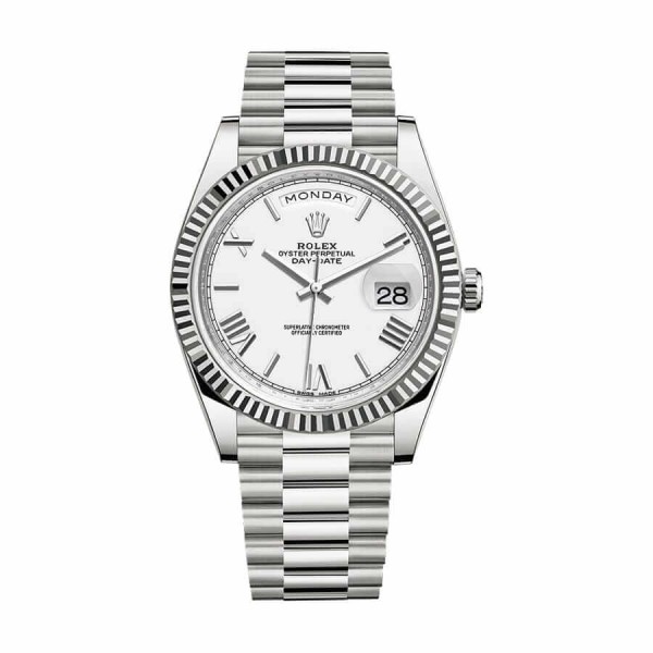 The Rolex Day-Date Stripe Dial Replica is a stunning watch. It features a 904L stainless steel case and bezel, both in white gold, and a sapphire crystal. The 40mm case is 12mm thick and is powered by an automatic 3255 caliber movement with a 60-hour power reserve and a precision of -3/+3 seconds per day within COSC certification limits. The white dial features Roman numerals and 904L stainless steel stick hands. The watch is water-resistant up to 30m and comes with a 2-year international warranty.