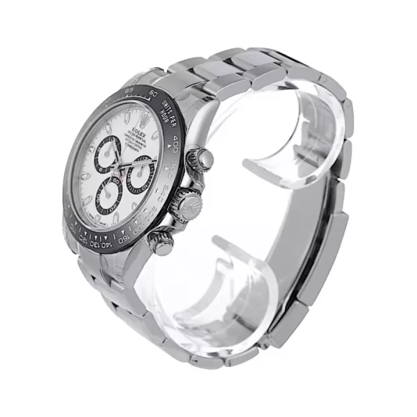 The watch is encased in a robust 40 mm Oystersteel case, designed for ultimate durability and refined aesthetics. Its black Cerachrom bezel with a tachymetric scale offers scratch resistance while adding a striking contrast to the polished steel case. The Oystersteel material is corrosion-resistant, maintaining the watch’s pristine appearance even in the harshest conditions.