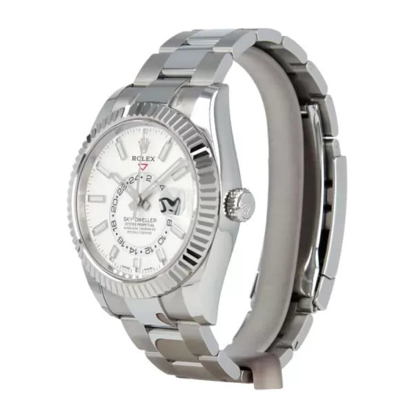 The Rolex Sky-Dweller 326934 White Dial Replica stands as a testament to the exquisite artistry and unmatched precision that Rolex is renowned for. This distinguished timepiece from the highly esteemed Oyster Perpetual collection harmonizes elegant design with practical functionality, catering to the modern-day sophisticate. Imagine the moment you clasp this watch around your wrist: its sturdy yet graceful 42mm Oyster case, crafted meticulously from solid 18k white gold, instantly commands attention. The case’s captivating sheen evokes a sense of opulence and authority, reflecting light in a manner that radiates luxury.