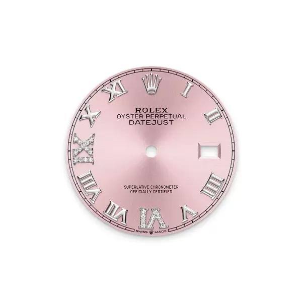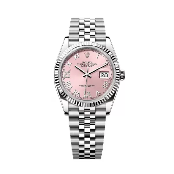 Its soft pink dial, adorned with stick hour markers and polished hands, gives the watch a distinctive yet sophisticated appeal. The date window with the classic Cyclops lens completes the true Datejust aesthetic.