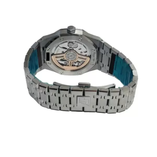 Its beautifully executed “Grande Tapisserie” dial features polished hour markers, luminous accents, and refined stick hands, creating a perfect balance of sportiness and elegance. The clean date display and precise proportions mirror the original 15500ST flawlessly.