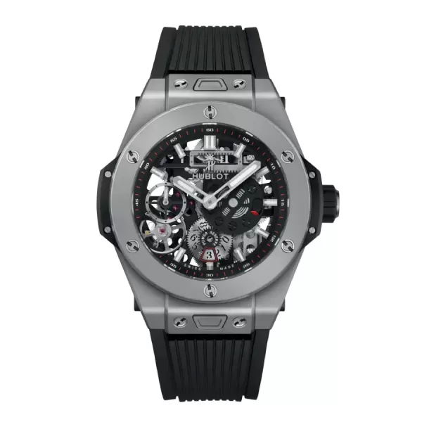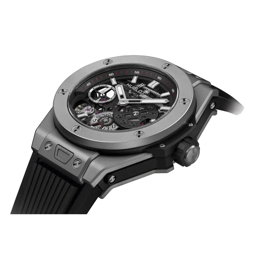 The 45 mm case is crafted in a titanium-style finish on premium materials, reflecting the lightweight yet robust character of the original MECA-10 design. Sapphire crystal on both the front and caseback provides exceptional clarity while showcasing the intricate skeletonized movement. The black rubber strap ensures superior comfort, durability, and modern sport-luxury appeal.