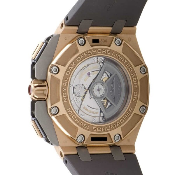 The Audemars Piguet Royal Oak Offshore Michael Schumacher Replica is a luxury watch. It features a 904L stainless steel case with a pink gold color and a grey bezel. The 44.00 mm case is 14.25 mm thick and is fitted with a sapphire crystal. The rubber bracelet is adjustable and features a 904L stainless steel pin clasp in pink gold. The grey dial features stick indeces and Royal Oak hour-markers in 904L stainless steel. The movement is an automatic AP 3126 / 3840 caliber with a 60-hour power reserve and a precision of (-3/+3 sec/day) within COSC certification limits.