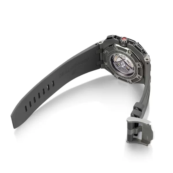 The Audemars Piguet Royal Oak Offshore 26568IM.OO.A004CA.01 is a luxury replica watch. It features a 904L stainless steel case and bezel, with a sapphire crystal and a 44.00 mm size and 14.25 mm thickness. The grey rubber bracelet is adjustable and features a 904L stainless steel fold clasp. The grey dial has stick indices and stick hands, both made of 904L stainless steel.