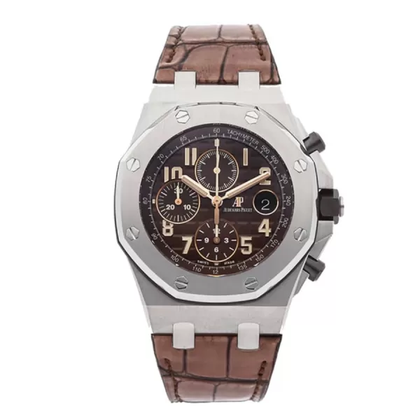 The Audemars Piguet Royal Oak Offshore Replica 26470ST.OO.A820CR.01 is a 1:1 super clone Swiss mechanism watch. It features a 904L stainless steel case and bezel, with a sapphire crystal and a steel color. The movement is an automatic AP 3126 / 3840 caliber with a 60-hour power reserve and a precision of (-3/+3 sec/day) within COSC certification limits. The dial is brown with Arabic numerals and 904L stainless steel hour markers and hands. The bracelet is a Royal Oak style with adjustable links, made of crocodile skin and a 904L stainless steel pin clasp.