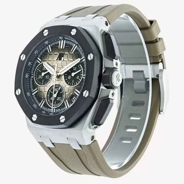 The timepiece boasts a robust 44mm diameter case, encapsulating a vivid green dial with Arabic numerals indices, offering a modern touch to this iconic design. Paired with a comfortable, adjustable rubber strap that fits all sizes, the watch remains as stylish as it is functional. Durability is key, with the watch passing a 30m water resistance test. However, the manufacturer advises against swimming while wearing the watch. Protected by a 2-year International United Luxury warranty, this “AP Royal Oak Offshore Ceramic Green Black” Replica Watch is a perfect blend of elegance, reliability, and precision – a stunning statement piece for any watch aficionado.