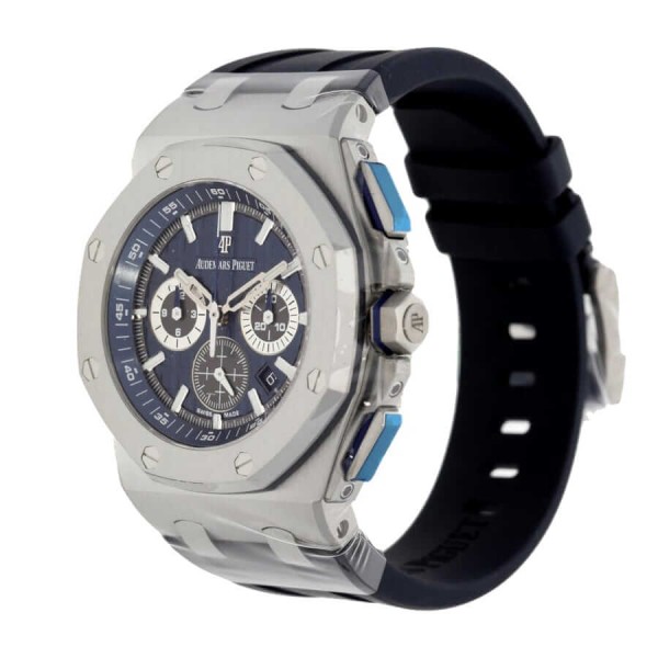 The Audemars Piguet Royal Oak Offshore 26480TI.OO.A027CA.01 replica is a striking watch. The case is made of 904L stainless steel and is 42.00 mm in size with a thickness of 12.80 mm. The bezel is also made of 904L stainless steel and is steel in color. The crystal is a sapphire crystal and the bracelet is made of rubber with adjustable links. The dial is blue with stick indices and ceramic stick hour markers. The hands are made of 904L stainless steel and are stick in type.