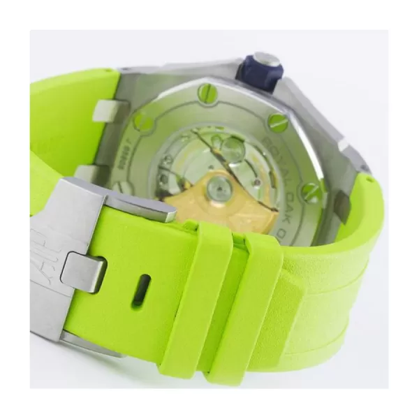 The Royal Oak Offshore Green Replica from Audemars Piguet is a striking watch. It features a 904L stainless steel case and bezel, with a sapphire crystal and a thickness of 14.75mm. The movement is an Automatic AP 3124 / 3841 caliber, with a power reserve of 60 hours and a precision of (-3/+3 sec/day) within COSC certification limits. The dial is green and black, with stick and dot indices, and 904L stainless steel stick hands. The bracelet is made of rubber, with adjustable links and a 904L stainless steel thorn clasp.