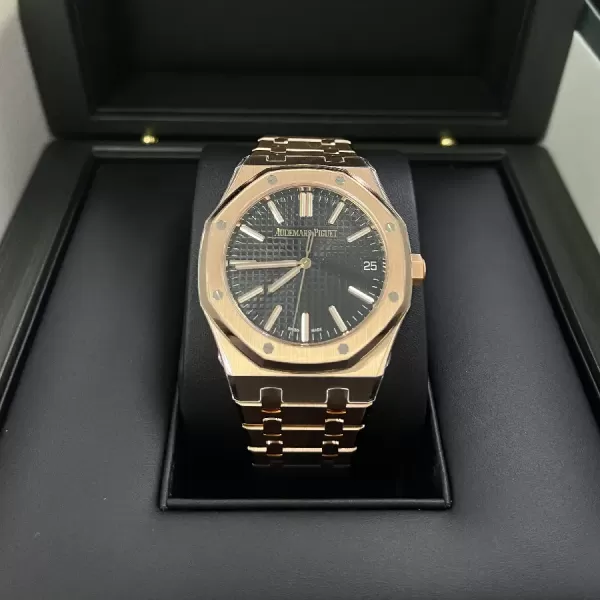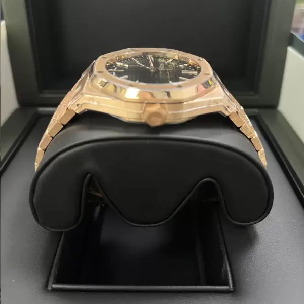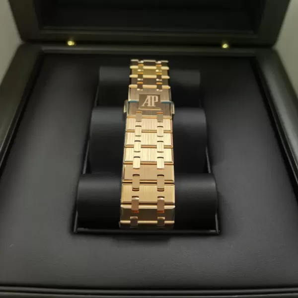 The 41 mm case is crafted from solid 904L stainless steel with a rich rose gold finish, perfectly matched with a Royal Oak integrated bracelet and folding AP clasp. The sapphire crystal provides durability and clarity while preserving the slim, elegant profile of the watch.