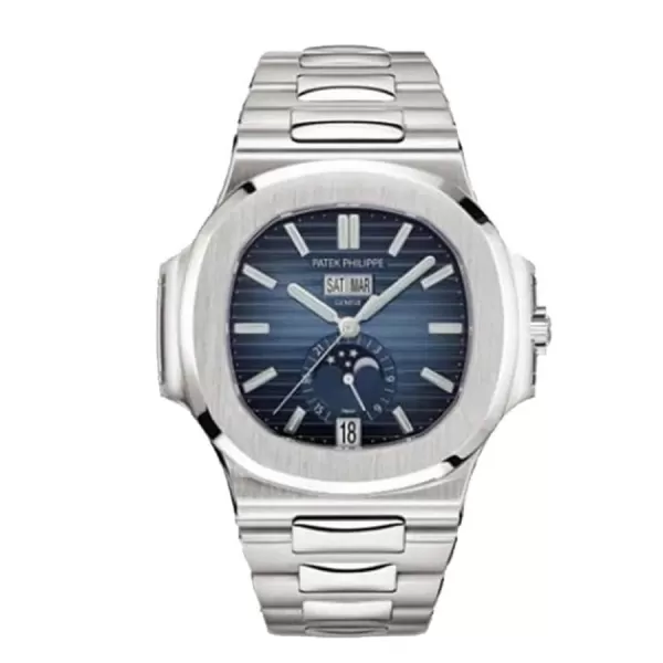 The Patek Philippe Blue Moon phase Replica is a high quality watch from the Nautilus family. It features an automatic movement with a caliber of 324 S QA LU 24H/303 and a power reserve of 60 hours. The precision of the watch is within COSC certification limits, with a sweep motion second hand. The case is made of 904L stainless steel and has a sapphire crystal. It is 40.50 mm in size and 11.30 mm in thickness. The bracelet is also made of 904L stainless steel and is adjustable for all sizes. The dial is blue with stick indices and stick hands made of stainless steel.