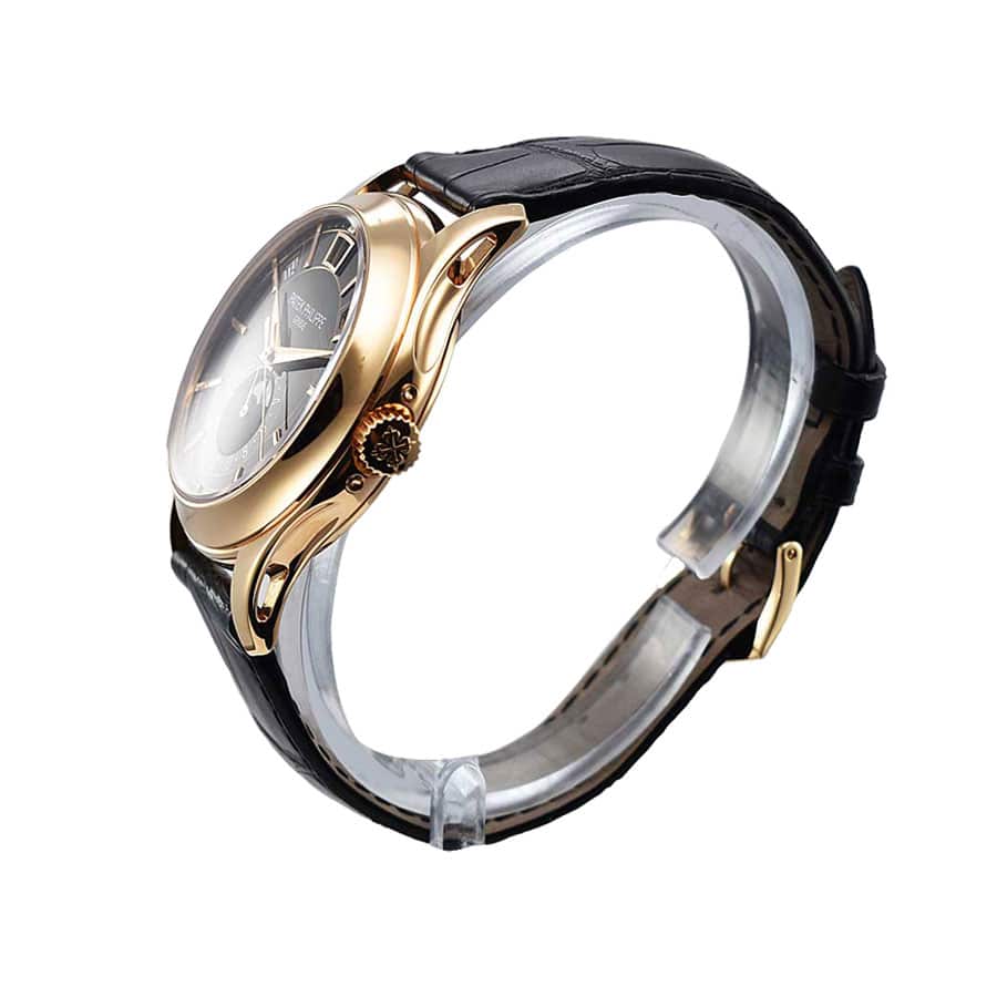 The Patek Philippe Complications Automatic Black Dial 5205R-010 Replica is a high quality watch. It features a 904L stainless steel case and rose gold bezel, with a sapphire crystal and 40.20 mm size. The black leather bracelet is adjustable and features a 904L stainless steel fold clasp in rose gold. The black dial has stick and dot indices, with 904L stainless steel stick hands.