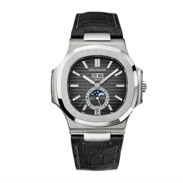 The Patek Philippe Nautilus 5726/1A-001 replica is a perfect 1:1 clone of the original. It features a 904L stainless steel case with a grey bezel and sapphire crystal. The movement is an automatic caliber 324 S QA LU 24H/303 with a power reserve of 60 hours and a precision of -3/+3 seconds per day within COSC certification limits. The bracelet is a croco leather with adjustable links and a 904L stainless steel fold-over clasp.The dial is grey with stick and dot indices and 904L stainless steel stick hands. The watch is water-resistant up to 30m and comes with a full 2 year international warranty. All materials and markings are identical to the original, making it impossible to tell the difference between the replica and the genuine watch. This is the perfect replica for those looking for a high-quality, indistinguishable copy of the original.