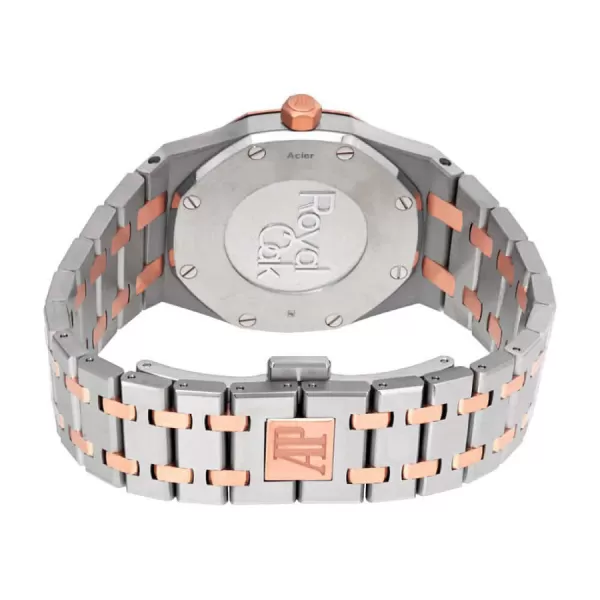 This Audemars Piguet Royal Oak replica watch is a perfect 1:1 clone of the original. It features a 904L stainless steel case with a pink gold and steel bezel, a sapphire crystal, and a 33.00 mm size and 07.00 mm thickness. The Royal Oak bracelet is adjustable for all sizes and is made of 904L stainless steel with a steel AP folding clasp. The dial is nicknamed the Grande Tapisserie and is pink with stick and dot indices. The hands are 904L stainless steel stick type.