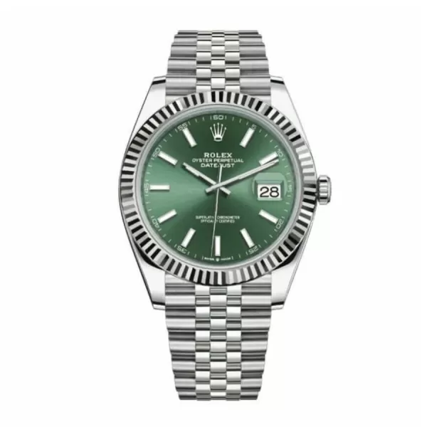 This Rolex Datejust 41 Oyster replica is a stunning piece of craftsmanship. It features a 904L stainless steel case, a white gold bezel, and a sapphire crystal. The 41mm case is adjustable to fit all sizes, and the Jubilee bracelet is made of 904L stainless steel. The mint green dial has stick and dot indices, and the hands are made of 904L stainless steel.